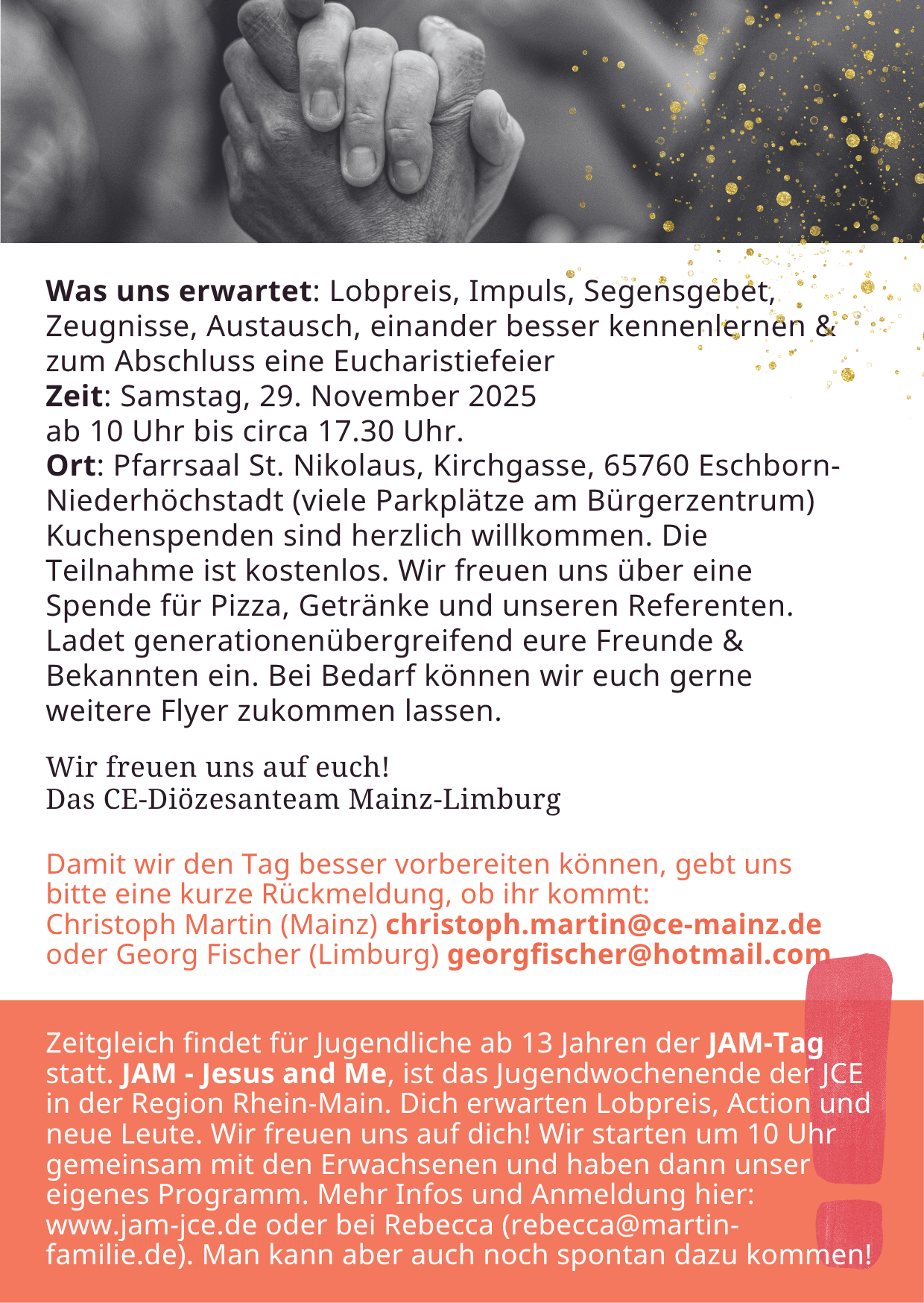 Am selben Nachmittag findet für Jugendliche ab 13 Jahren der JAM-Tag statt. JAM – Jesus and Me, ist das Jugendwochenende der JCE in der Region Rhein-Main. Dich erwarten Lobpreis, Action und neue Leute. Wir freuen uns auf dich! Wir beginnen um 10 Uhr gemeinsam mit den Erwachsenen und haben danach unser eigenes Programm. Mehr Infos und Anmeldung hier ab Sommer 2025.